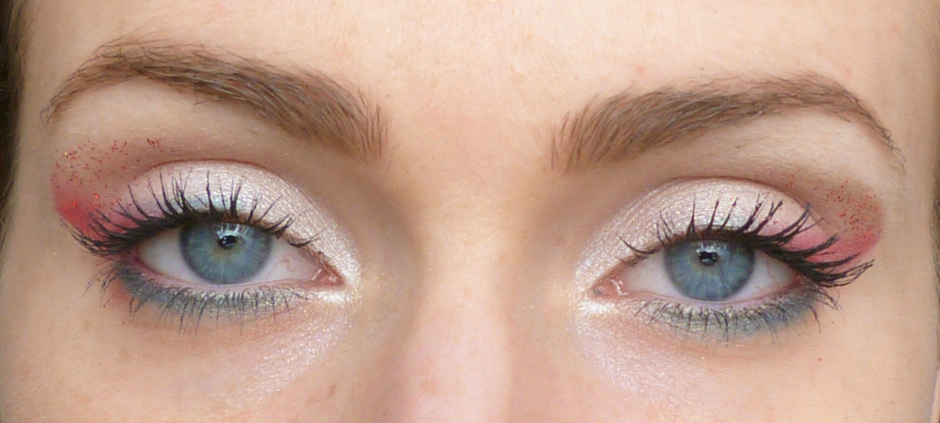 • Au coin externe de la paupière mobile j’ai utilisé des paillettes rouge que j’ai posées avec un pinceau humide