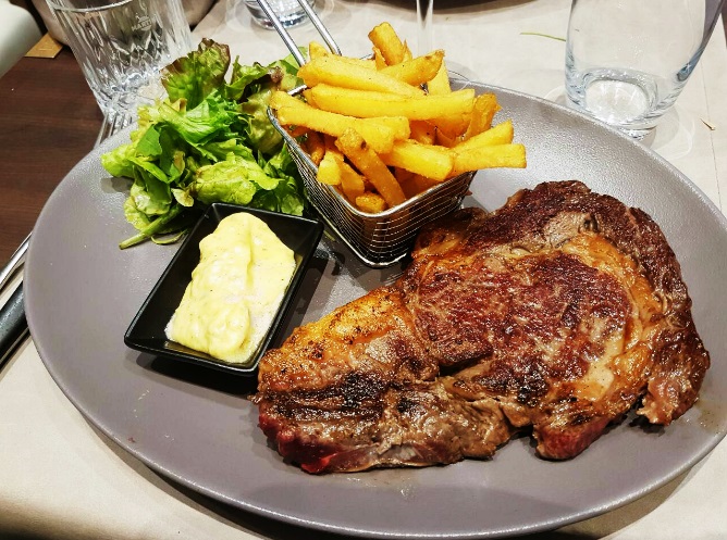 En plat Mon Barbu n’a pas vraiment hésité, il a choisi une viande et pas n’importe laquelle: une entrecôte avec ses frites. On a beaucoup aimé la présentation de la portion de frite, c’était super mignon!