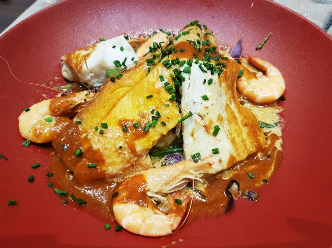 Moi je me suis plutôt dirigée vers un poisson, j’ai choisi la marmite du pêcheur. Elle se composait de 4 poissons différents dont certains étaient fumés et pour le coup un petit peu trop salé à mon goût. Mon plat était aussi agrémenté de crevettes et je pouvais découvrir en dessous une purée de pomme de terre avec quelques petits légumes.