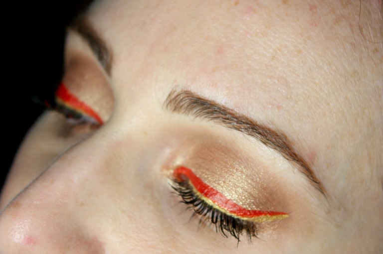 Ma petit touche d’originalité revient à mon double liner! J’ai utilisé mes fards à l’eau SB Makeup car bien entendu je n’ai pas de liner de ces couleurs. J’ai tracé un premier trait avec un de mes fards couleur or puis un second avec mon fard rouge. La tache n’est pas évidente. C’est la première fois que je réalisé un double liner et cela nécessite de l’entraînement! J’ai rattrapé le coup, je ne suis pas trop mécontente du résultat.