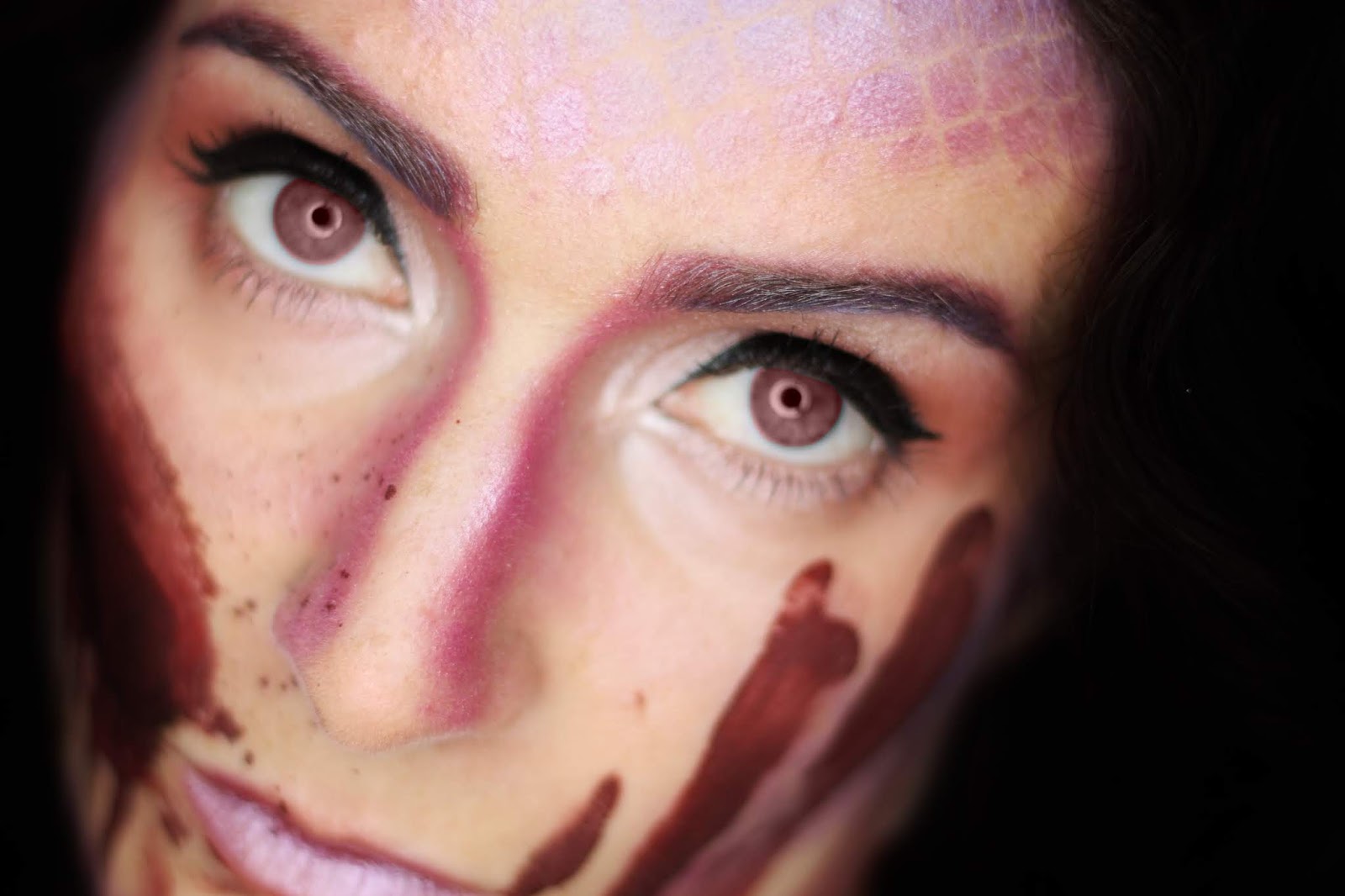 J’ai tout misé sur la plaie et j’avoue m’être rendu compte beaucoup trop tard que j’avais trop délaissé le côté sirène. Du coup, je ne suis pas plus satisfaite que ça de mon maquillage. Les couleurs des écailles ne ressortent pas vraiment, si j’avais su j’aurais utilisé mes fards à l’eau qui auraient donné un côté beaucoup plus intense.