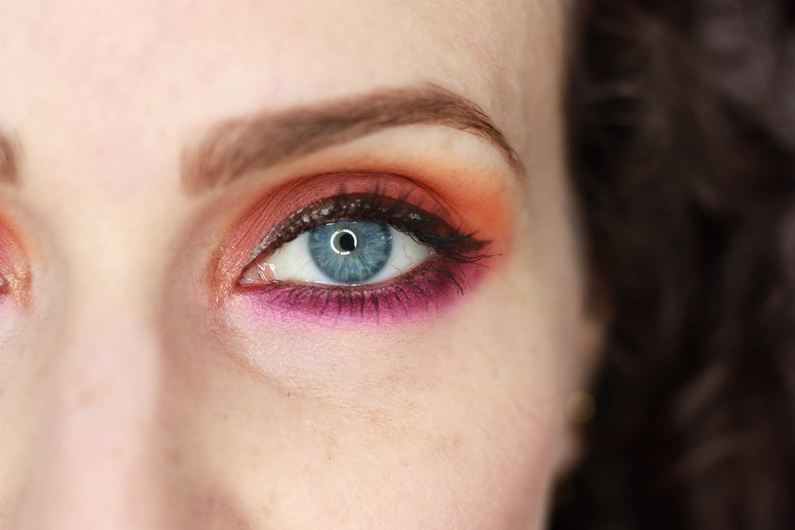 Pour le ras de cil inférieur j’ai utilisé le fard Skip, c’est un rose très flashy sur lequel j’ai posé le fard Single en étirant le tout vers l’extérieur de l’œil. Dans la muqueuse de l’œil j’ai utilisé un crayon Kiko violet foncé. Enfin au coin interne de l’œil, j’ai utilisé le fard So good.