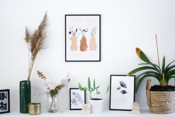 Pour commencer, j’ai associé les trois premiers posters qui sont des illustrations de fleurs qui bien qu’elles soient dans des styles différents se marient bien ensemble. J’aime beaucoup leur association qui ressort très bien sur un mur blanc. J’ai choisi des cadres noir en métal pour les faire ressortir et trancher avec le mur.