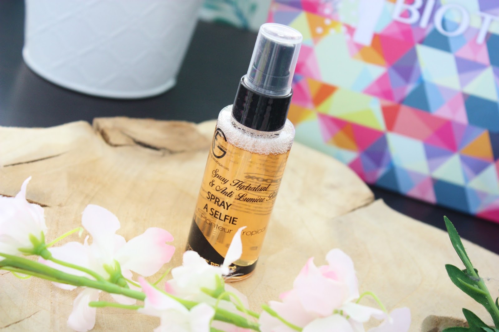 Le spray à selfie est une exclusivité Biotyfull Box. Il permet d’hydrater la peau et la protège contre les lumières bleues de nos appareils électroniques. Il contient de l’aloe vera, de l’acide hyaluronique et des extraits marins qui permettent d’hydrater la peau. Mais aussi des extraits de bleuets aux propriétés apaisantes et enfin un extrait de feuille d’olivier qui permet de filtrer la lumière bleue. J’aime beaucoup l’odeur de ce spray, super fraîche et fruitée!